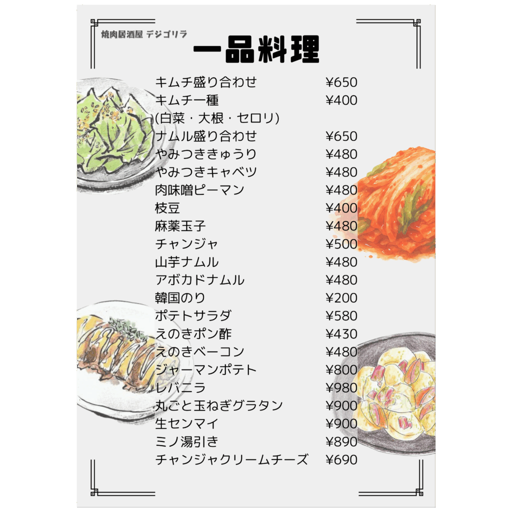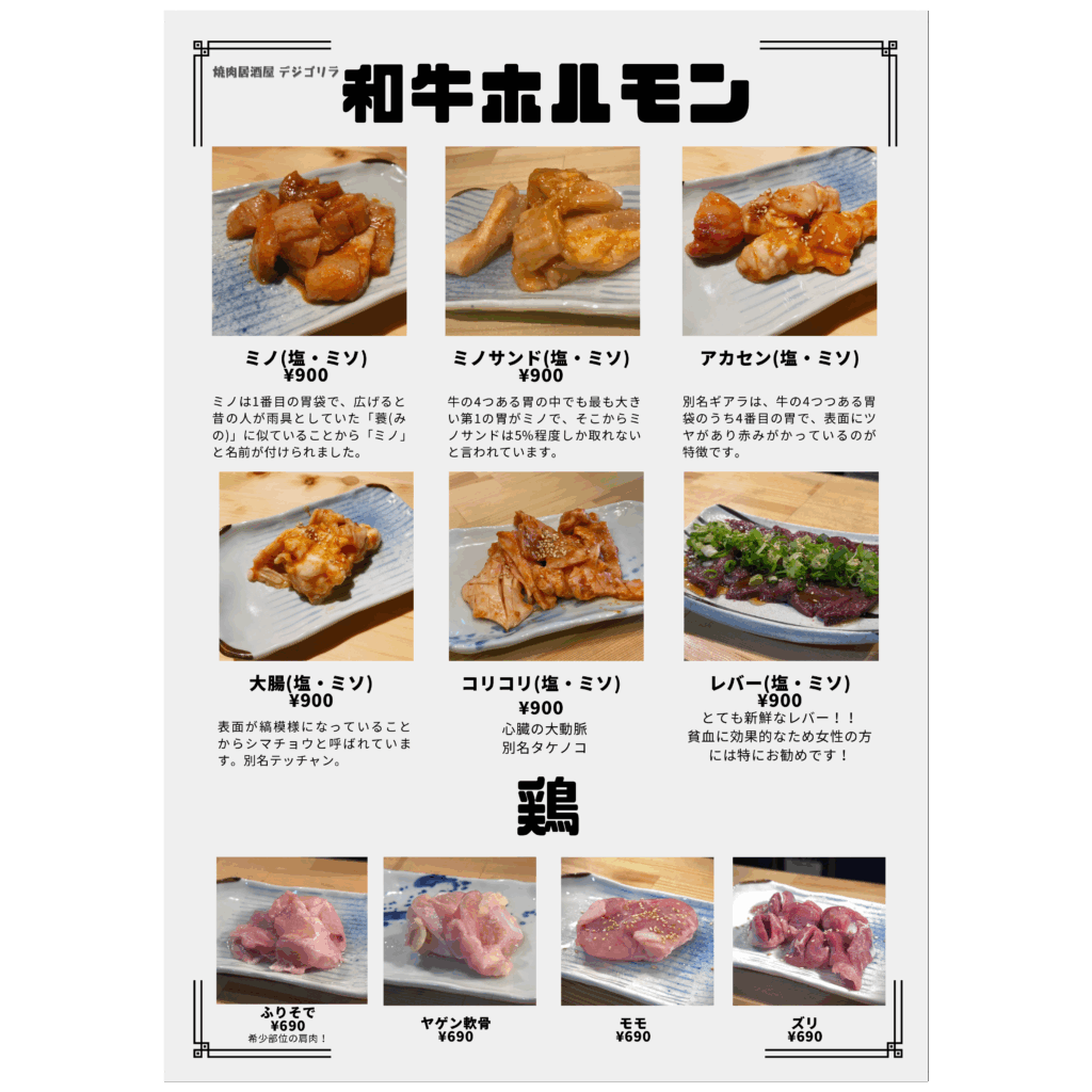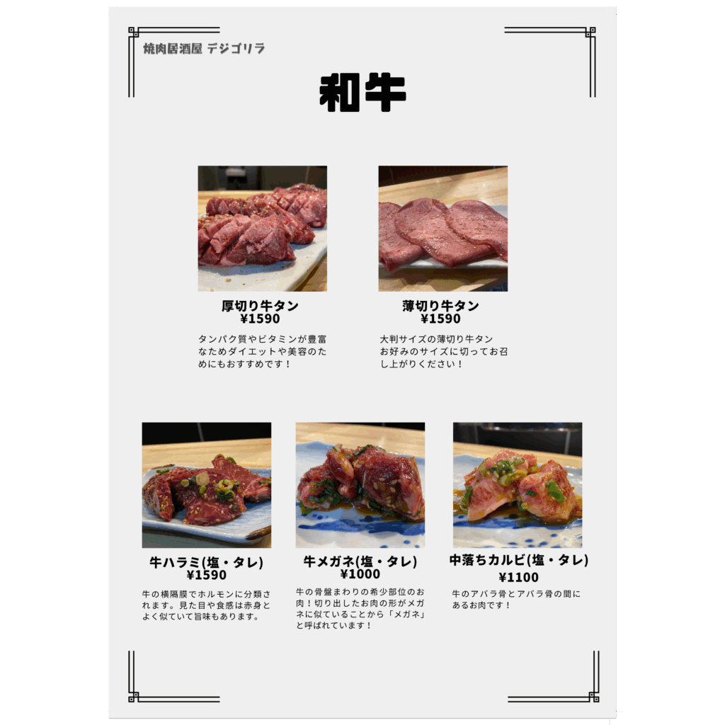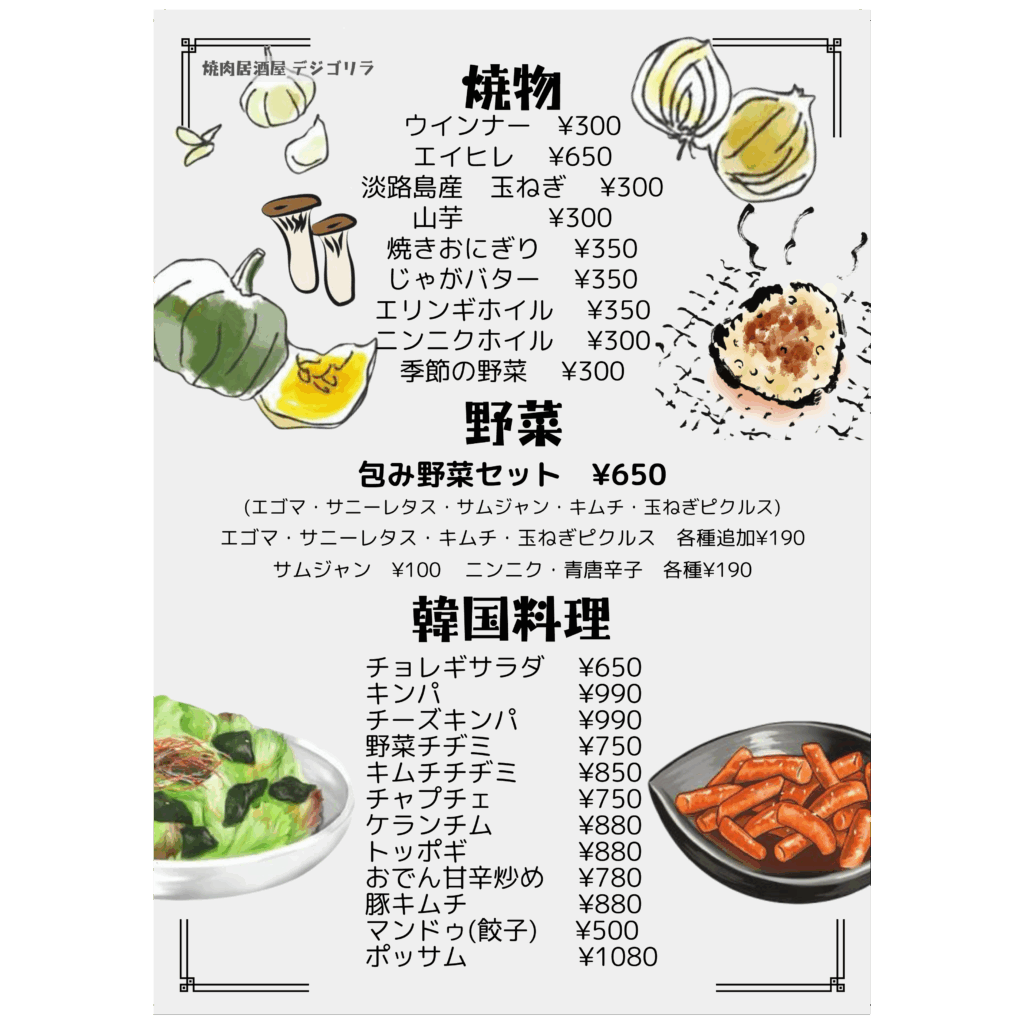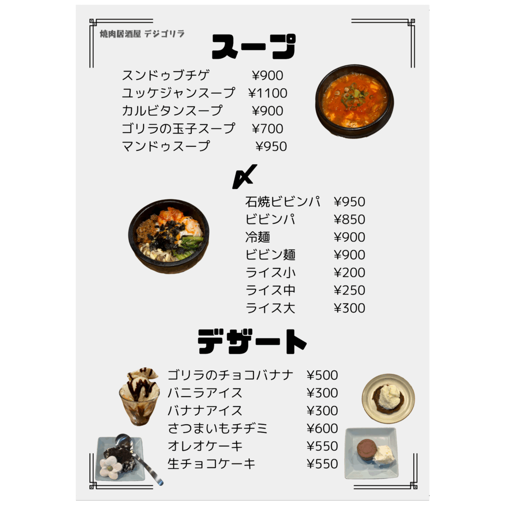 メニュー デジゴリラ名物 ~芳寿豚~ 炭ギョプサル(包み野菜セット付き) デジゴリ⼈気No1.2を争う定番メニュー!! 豚バラ!!この脂はお腹に残らない ¥1,590 炭モクサル(包み野菜セット付き) デジゴリラ⼈気No1.2を争う定番メニュー!! 豚ロース!ステーキのジューシーがたまらん! ¥1,590 生カルビ 芳寿豚のスペアリブ!! 豚カルビ ¥990 ヤンニョムカルビ 芳寿豚のスペアリブ!! 味付け豚カルビ ¥990 豚肩ロースユッケ⾵炙り焼き サッと焼いて、特製ユッケダレでお召し上がりください! ご飯のお供間違いなし! ¥890 特上豚タン 芳寿豚の希少部位のタン!! 歯応えのなかにさっぱりした味わい! 数量限定です ¥990 デジゴリ盛 困ったときの芳寿豚盛り合わせ!! 色んな芳寿豚をご堪能下さい ¥5,980 ディナーメニュー ドリンクメニュー クリーミーな泡 ミクロン単位のきめ細やかさを実現したクリーミーな泡。細やかな霧状の泡の層を生み、飲むたびに泡が再生し長持ちします。 クリアなビール ジョッキやタンブラーを徹底的に洗浄し飲むたびにレーシングができる爽やかな味わいの黒ラベルを実現。 徹底した温度管理 グラス・樽・注出というすべての温度管理を徹底します。黒ラベル本来の味や香りが楽しめる注出時2~6℃の温度管理を実現します。 ディナーメニュー ドリンクメニュー クリーミーな泡 ミクロン単位のきめ細やかさを実現したクリーミーな泡。細やかな霧状の泡の層を生み、飲むたびに泡が再生し長持ちします。 クリアなビール ジョッキやタンブラーを徹底的に洗浄し飲むたびにレーシングができる爽やかな味わいの黒ラベルを実現。 徹底した温度管理 グラス・樽・注出というすべての温度管理を徹底します。黒ラベル本来の味や香りが楽しめる注出時2~6℃の温度管理を実現します。 ランチメニュー トンテキ定食 人気No.1 こだわりの芳寿豚使用! ¥1,000 オプション:トンテキをガッツリ食べたい方へ!! ダブル(肉2枚): ¥1,800 トリプル(肉3枚): ¥2,600 フードロス削減のため食べきれる量の注文お願い致します。 牛ハラミ定食 数量限定! 人気沸騰中!待望の新メニュー! ¥1,000 石焼ビビンパ定食 石鍋でしか味わえないパリパリアツアツをどうぞ! ¥800 スンドゥブチゲ定食 この辛さがたまらない! ¥800 カルビタンスープ定食 牛骨ベースのあっさりスープ ¥800 ライス大盛りは別途 ¥100いただきます