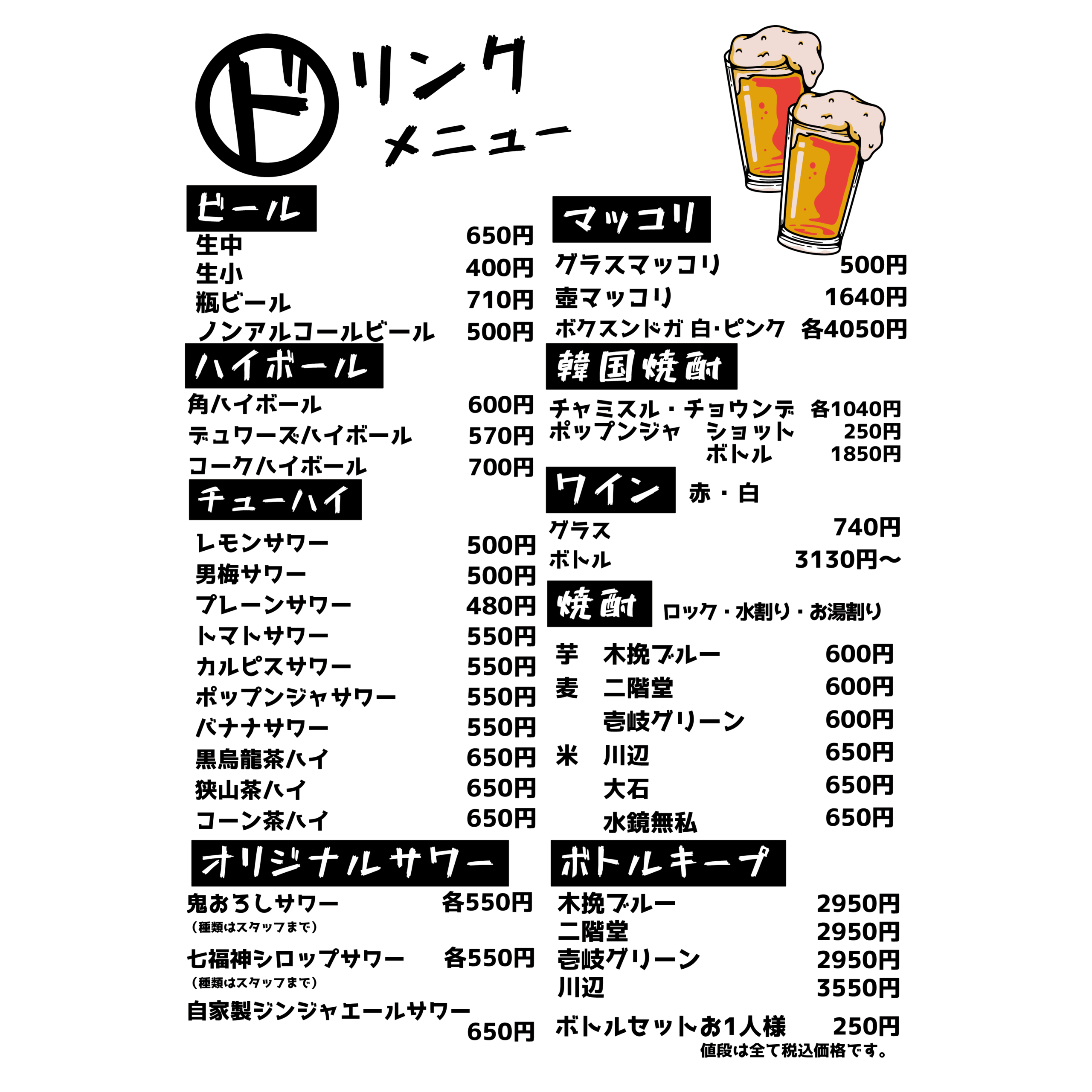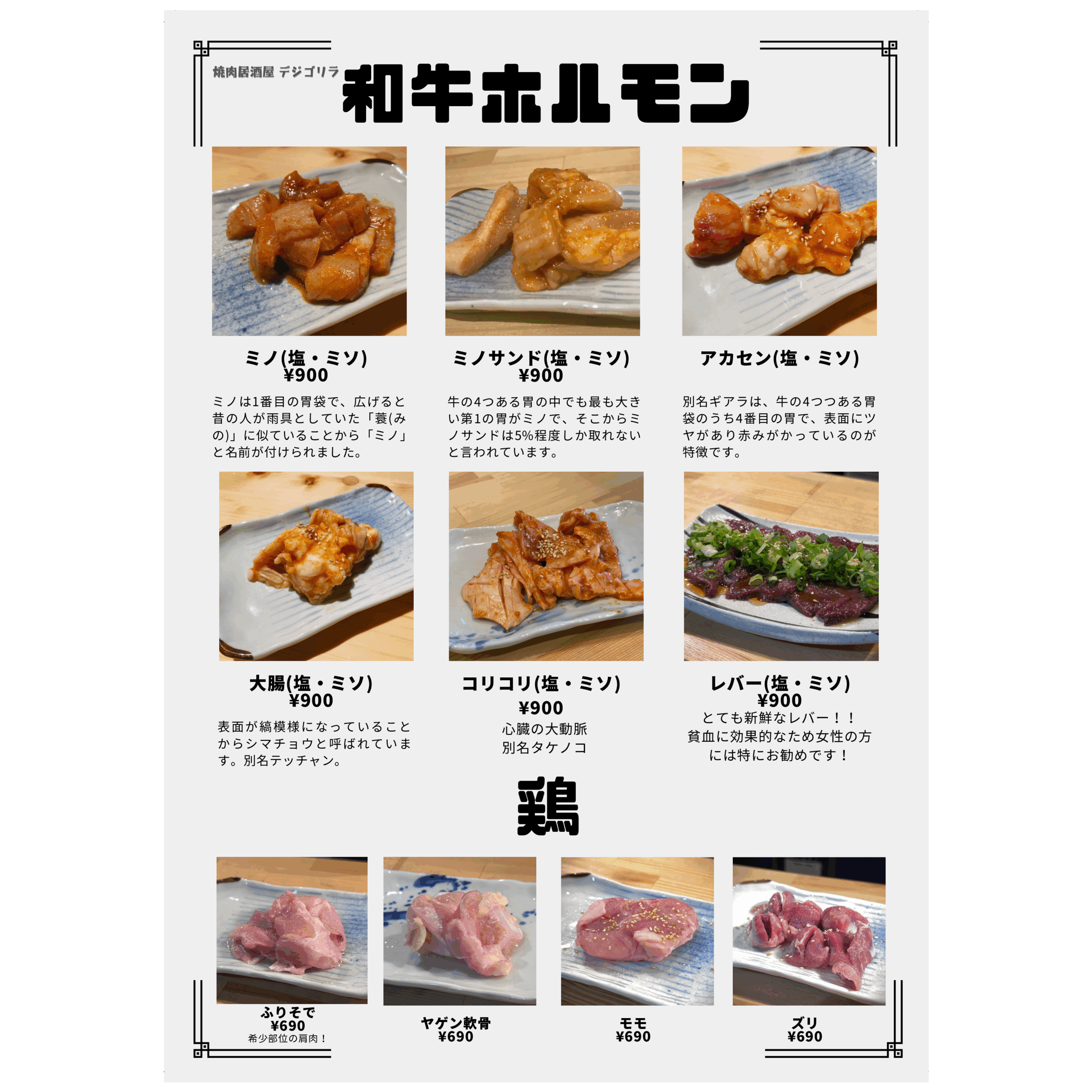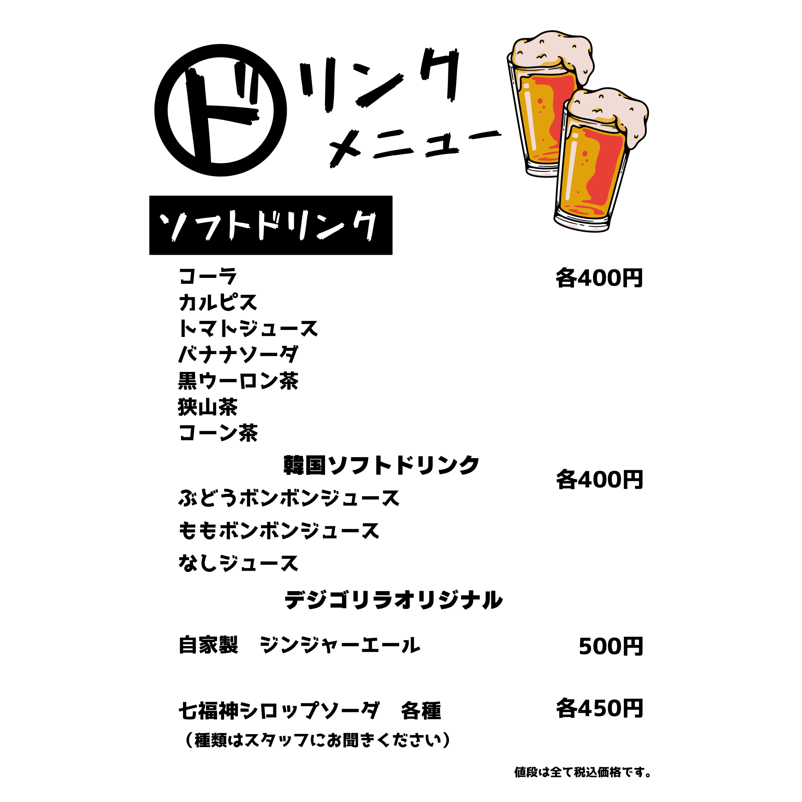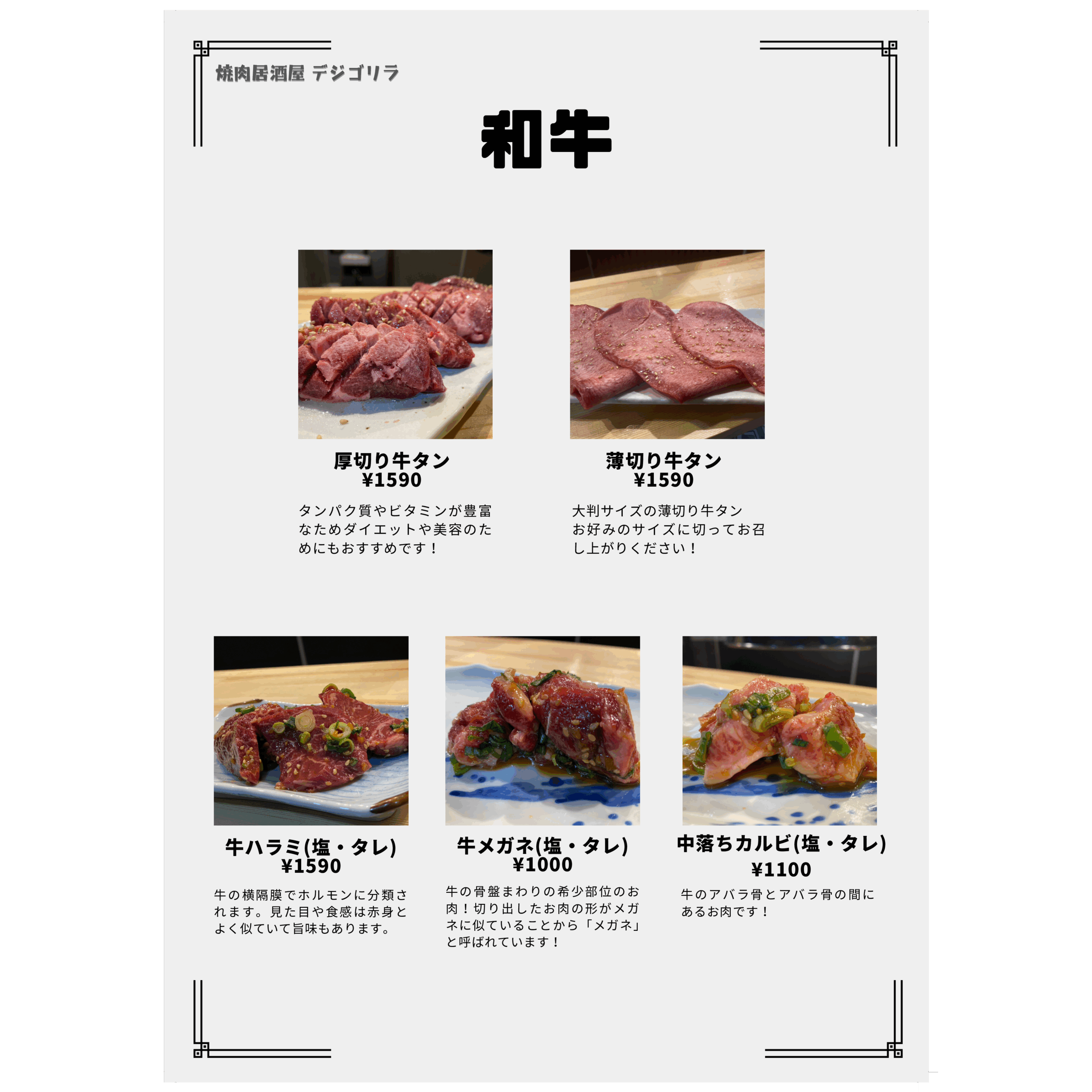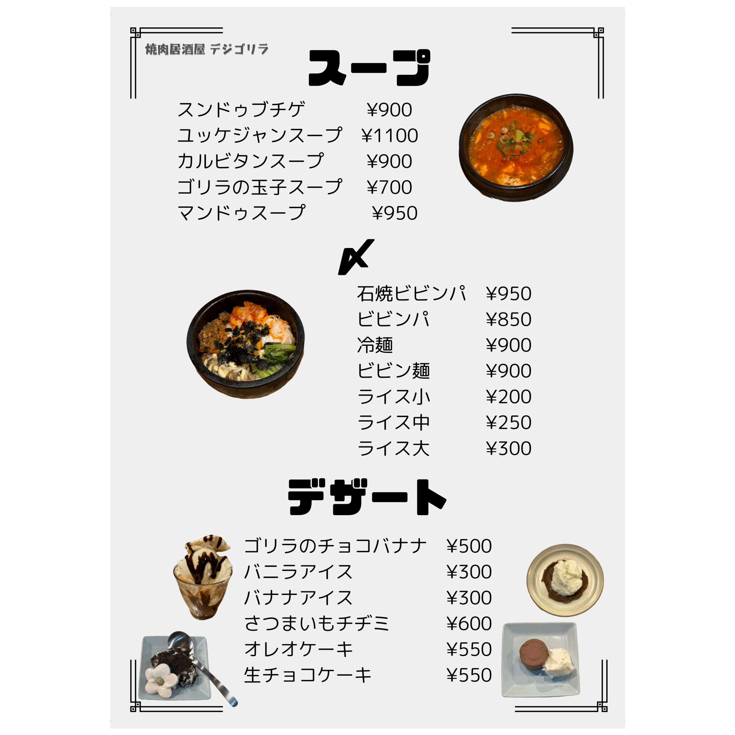 メニュー デジゴリラ名物 ~芳寿豚~ 炭ギョプサル(包み野菜セット付き) デジゴリ⼈気No1.2を争う定番メニュー!! 豚バラ!!この脂はお腹に残らない ¥1,590 炭モクサル(包み野菜セット付き) デジゴリラ⼈気No1.2を争う定番メニュー!! 豚ロース!ステーキのジューシーがたまらん! ¥1,590 生カルビ 芳寿豚のスペアリブ!! 豚カルビ ¥990 ヤンニョムカルビ 芳寿豚のスペアリブ!! 味付け豚カルビ ¥990 豚肩ロースユッケ⾵炙り焼き サッと焼いて、特製ユッケダレでお召し上がりください! ご飯のお供間違いなし! ¥890 特上豚タン 芳寿豚の希少部位のタン!! 歯応えのなかにさっぱりした味わい! 数量限定です ¥990 デジゴリ盛 困ったときの芳寿豚盛り合わせ!! 色んな芳寿豚をご堪能下さい ¥5,980 ディナーメニュー ドリンクメニュー クリーミーな泡 ミクロン単位のきめ細やかさを実現したクリーミーな泡。細やかな霧状の泡の層を生み、飲むたびに泡が再生し長持ちします。 クリアなビール ジョッキやタンブラーを徹底的に洗浄し飲むたびにレーシングができる爽やかな味わいの黒ラベルを実現。 徹底した温度管理 グラス・樽・注出というすべての温度管理を徹底します。黒ラベル本来の味や香りが楽しめる注出時2~6℃の温度管理を実現します。 ディナーメニュー ドリンクメニュー クリーミーな泡 ミクロン単位のきめ細やかさを実現したクリーミーな泡。細やかな霧状の泡の層を生み、飲むたびに泡が再生し長持ちします。 クリアなビール ジョッキやタンブラーを徹底的に洗浄し飲むたびにレーシングができる爽やかな味わいの黒ラベルを実現。 徹底した温度管理 グラス・樽・注出というすべての温度管理を徹底します。黒ラベル本来の味や香りが楽しめる注出時2~6℃の温度管理を実現します。 ランチメニュー トンテキ定食 人気No.1 こだわりの芳寿豚使用! ¥1,000 オプション:トンテキをガッツリ食べたい方へ!! ダブル(肉2枚): ¥1,800 トリプル(肉3枚): ¥2,600 フードロス削減のため食べきれる量の注文お願い致します。 牛ハラミ定食 数量限定! 人気沸騰中!待望の新メニュー! ¥1,000 石焼ビビンパ定食 石鍋でしか味わえないパリパリアツアツをどうぞ! ¥800 スンドゥブチゲ定食 この辛さがたまらない! ¥800 カルビタンスープ定食 牛骨ベースのあっさりスープ ¥800 ライス大盛りは別途 ¥100いただきます